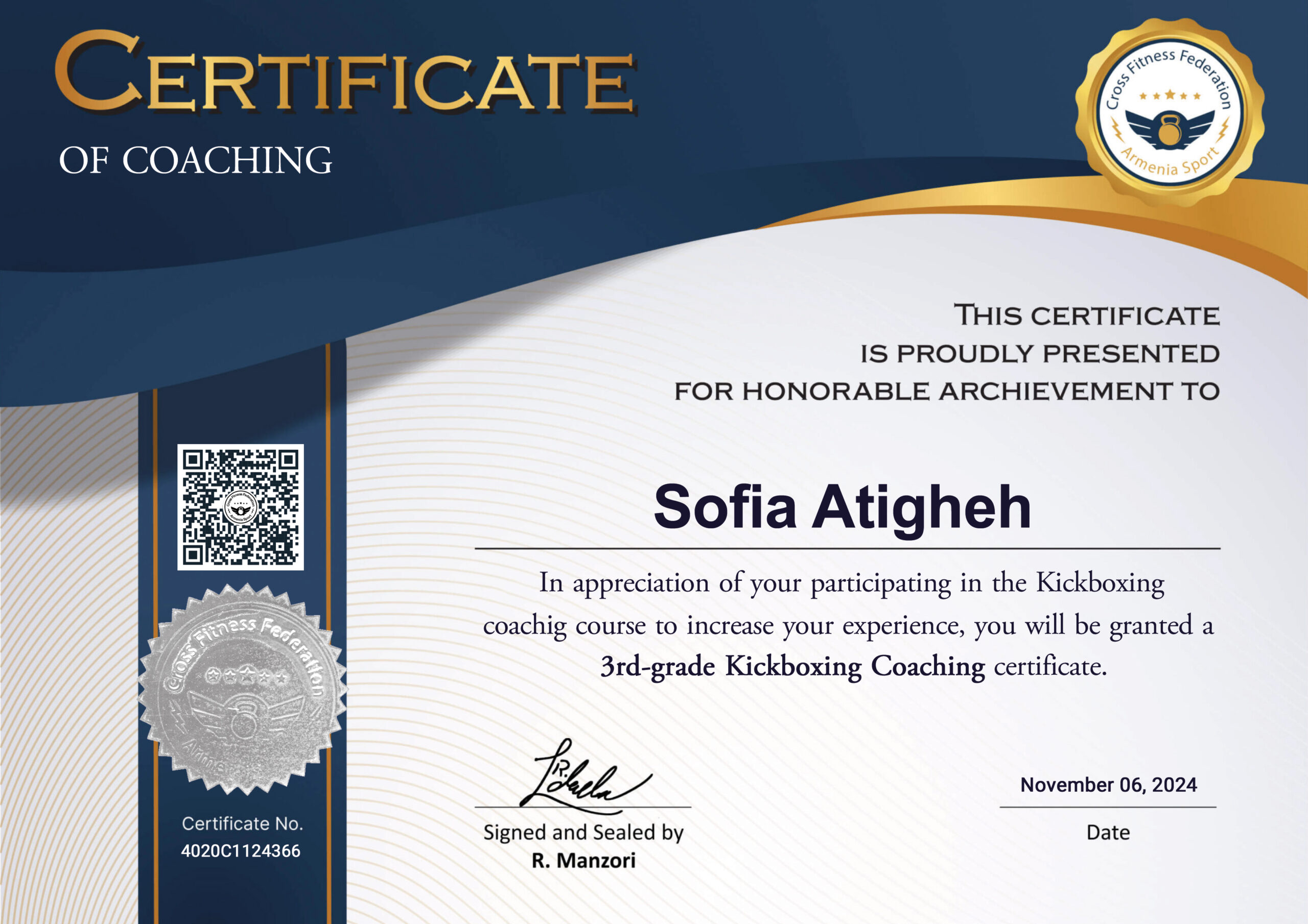 December 17, 2024 By : admin Comments : (0) Sofia Atigheh Certified kickbixing Coaching Grade C Certificate No. 4020C1124366 Download Certificate PDF